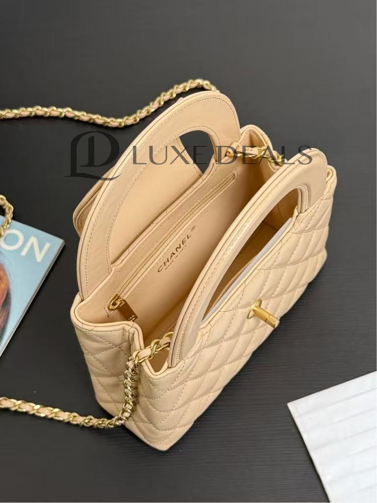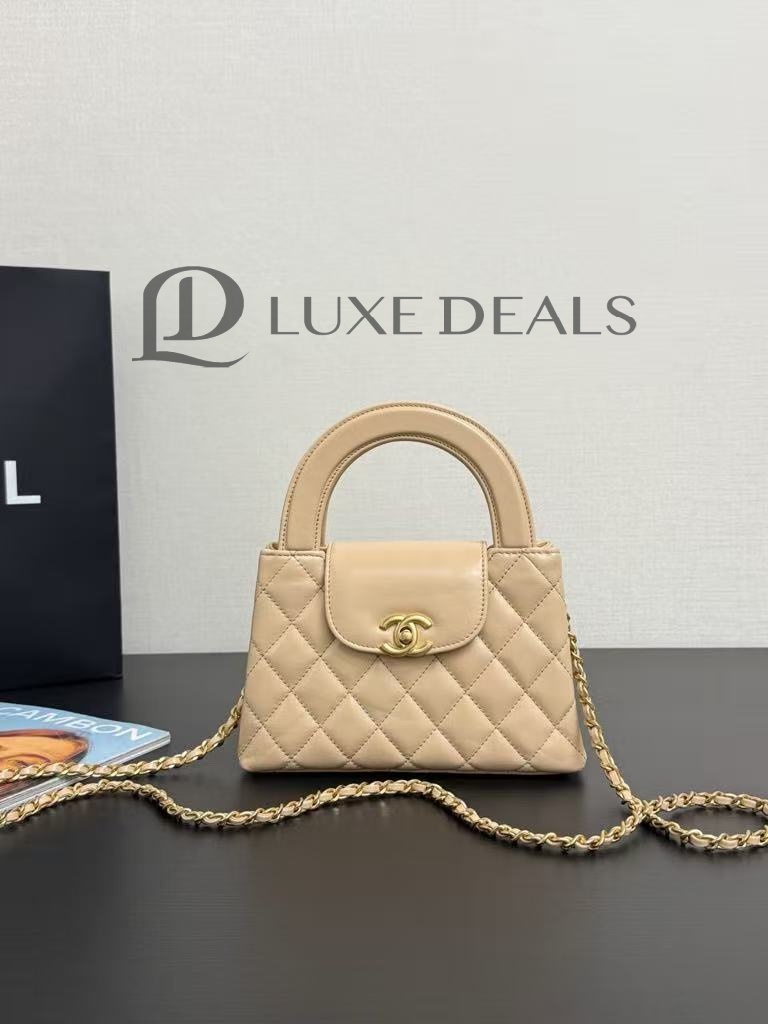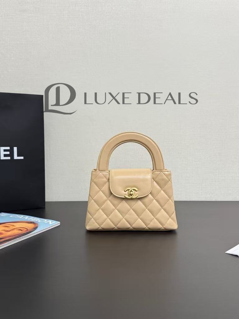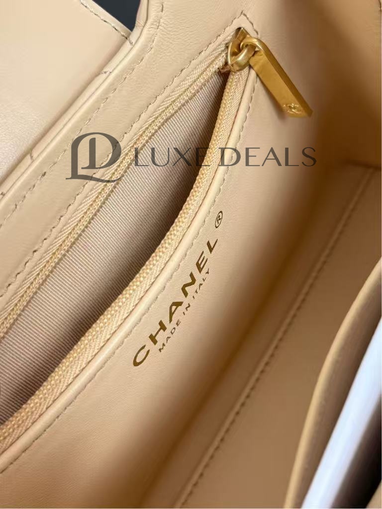 CH@NEL MASTER KELLY SHOPPER BEIGE SHINY CALFSKIN BRUSHED GOLD HARDWARE AS4416 (19*13*7cm)