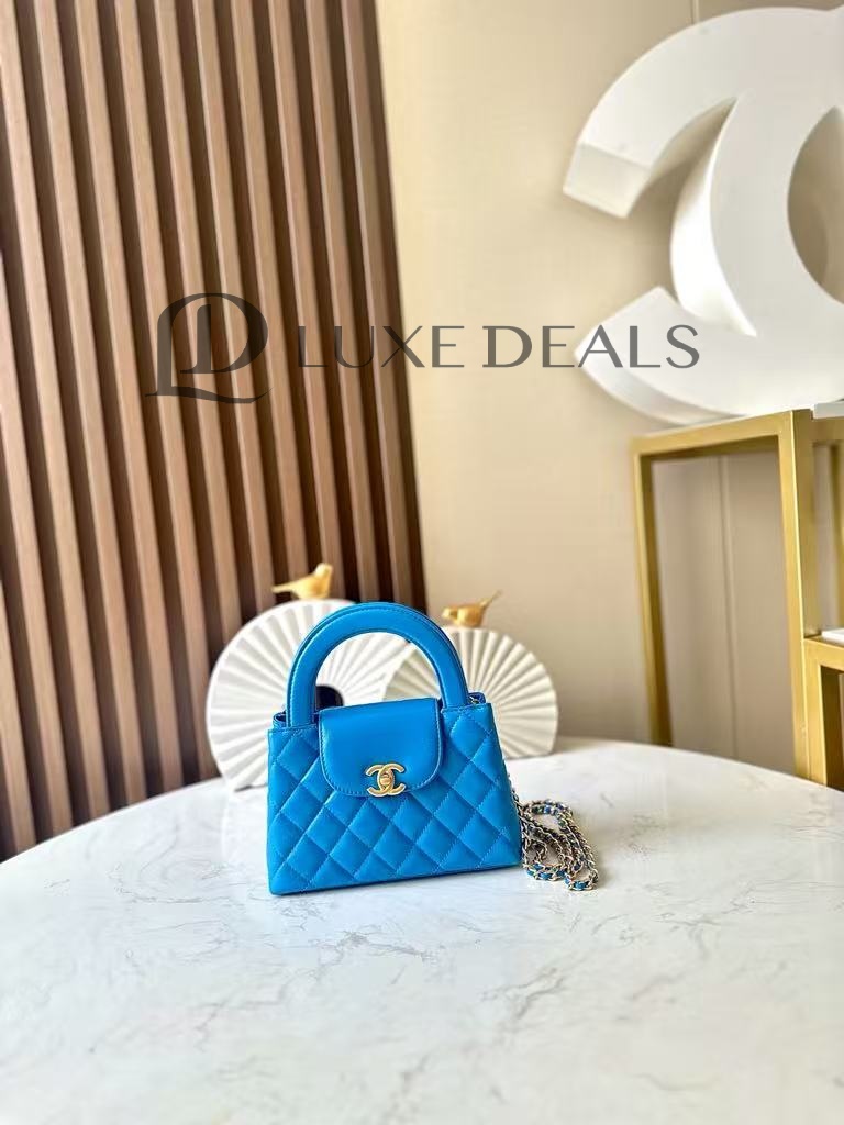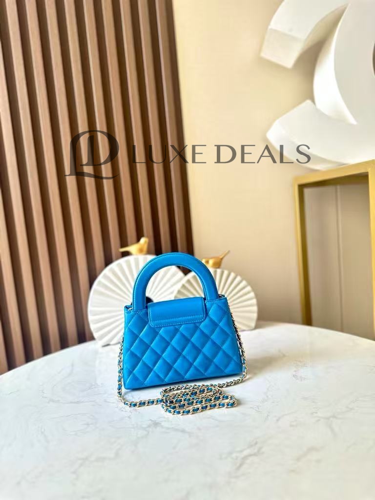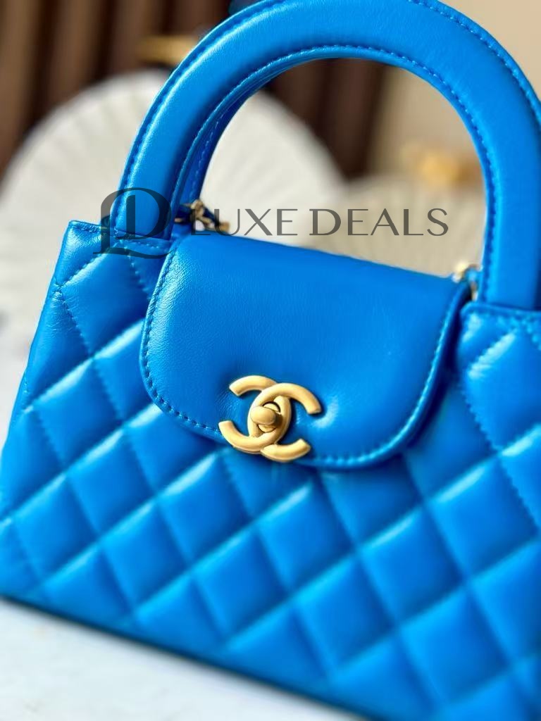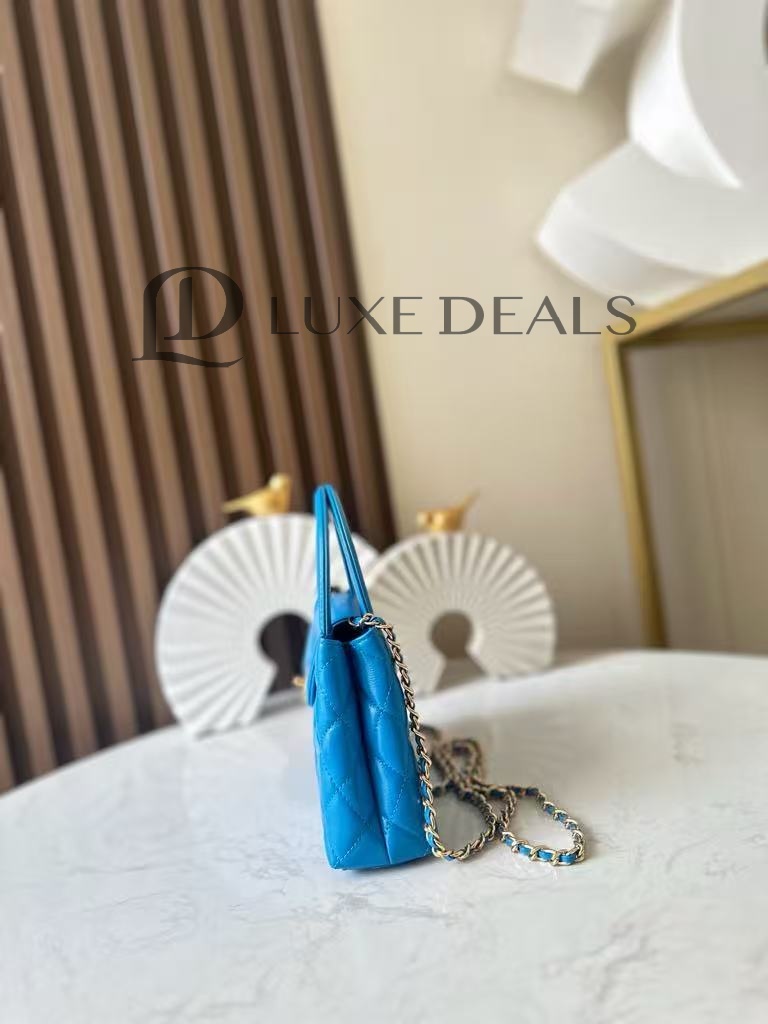 CH@NEL MASTER SHINY CALFSKIN QUILTED NANO KELLY SHOPPER BLUE AS4416 (19*13*7cm)