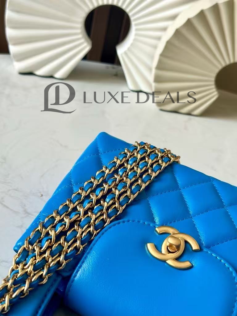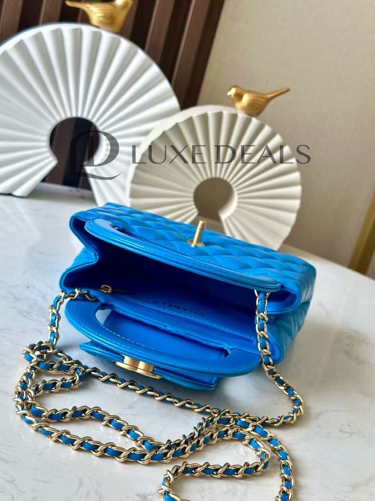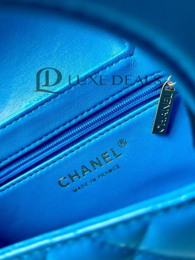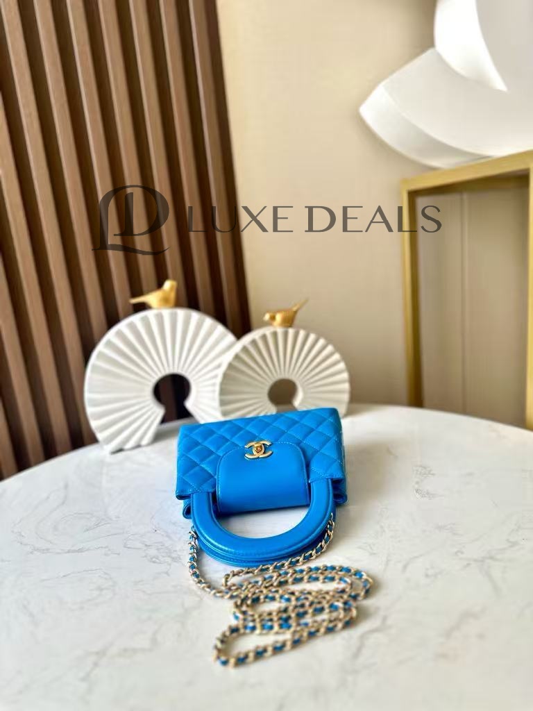 CH@NEL MASTER SHINY CALFSKIN QUILTED NANO KELLY SHOPPER BLUE AS4416 (19*13*7cm)