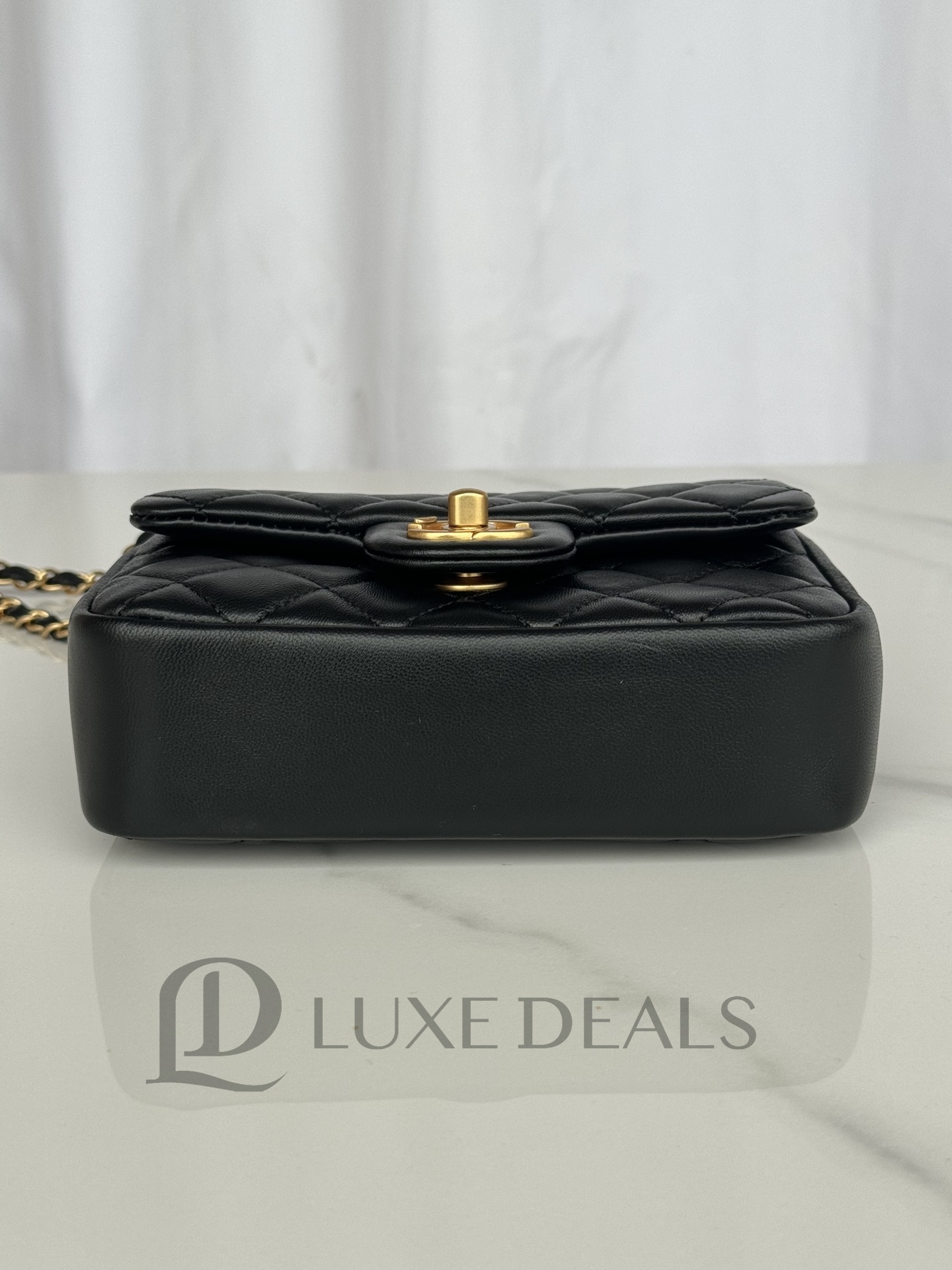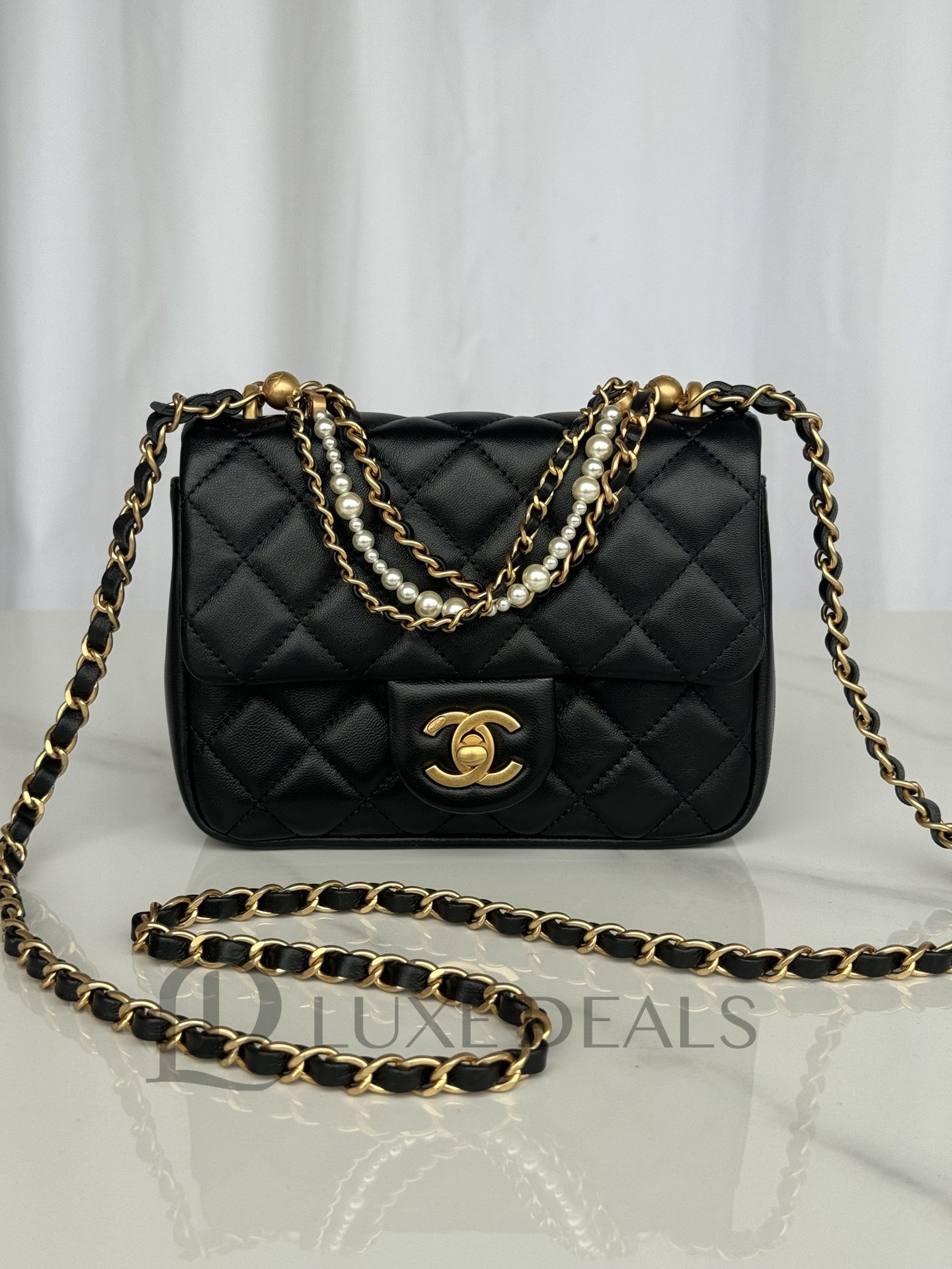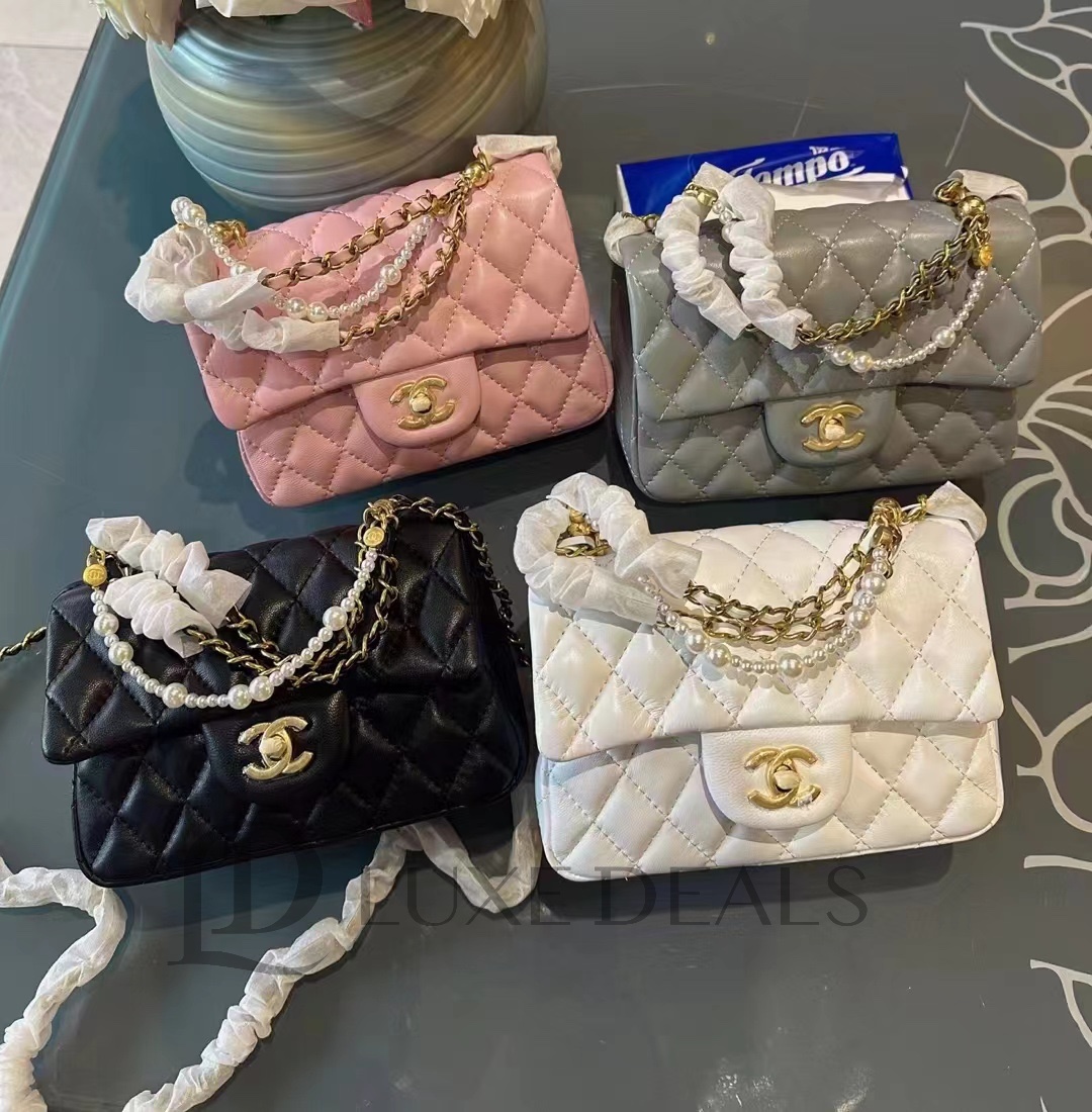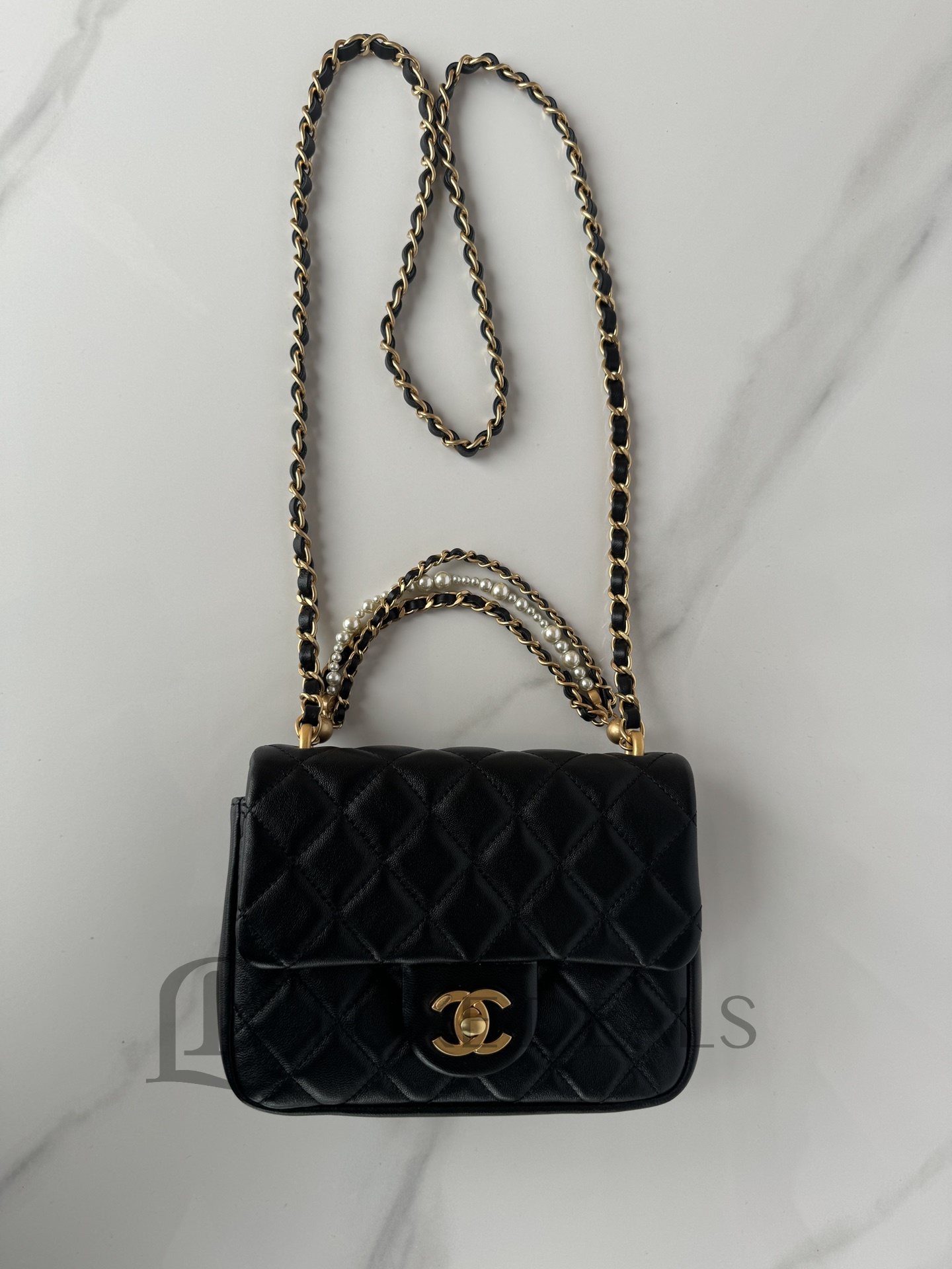 CH@NEL SHINY LAMBSKIN QUILTED PEARL TWIST MINI SQUARE FLAP BLACK AS4385 (17*12.5*5cm)