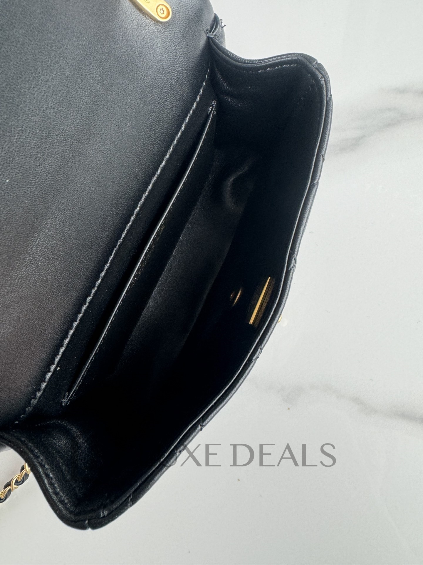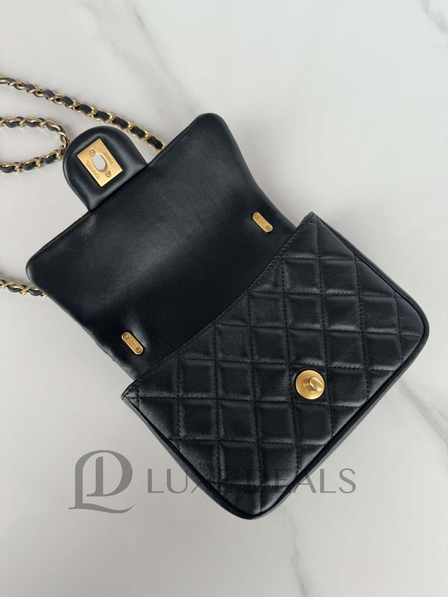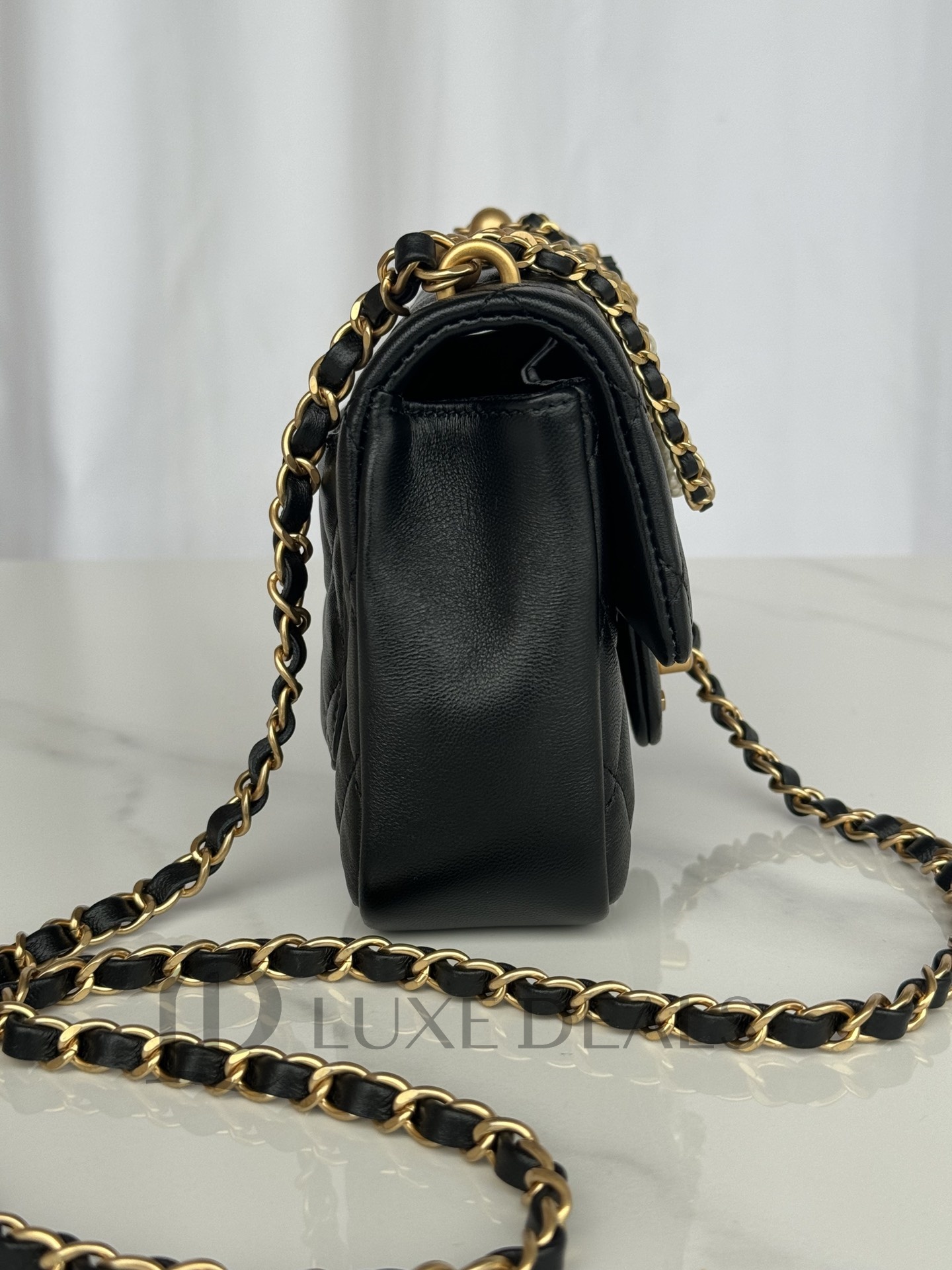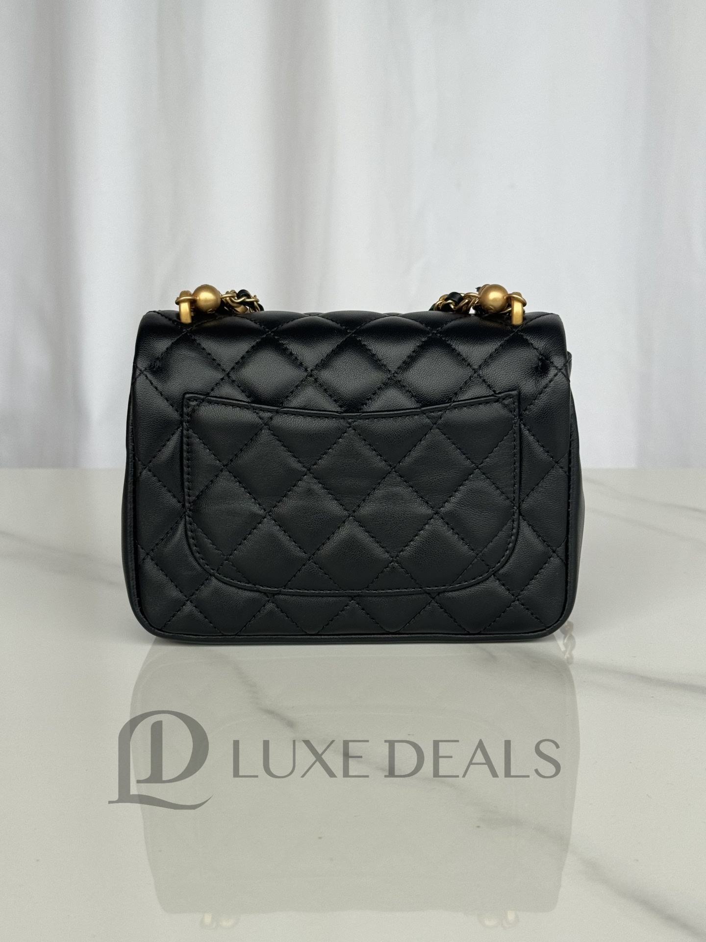 CH@NEL SHINY LAMBSKIN QUILTED PEARL TWIST MINI SQUARE FLAP BLACK AS4385 (17*12.5*5cm)