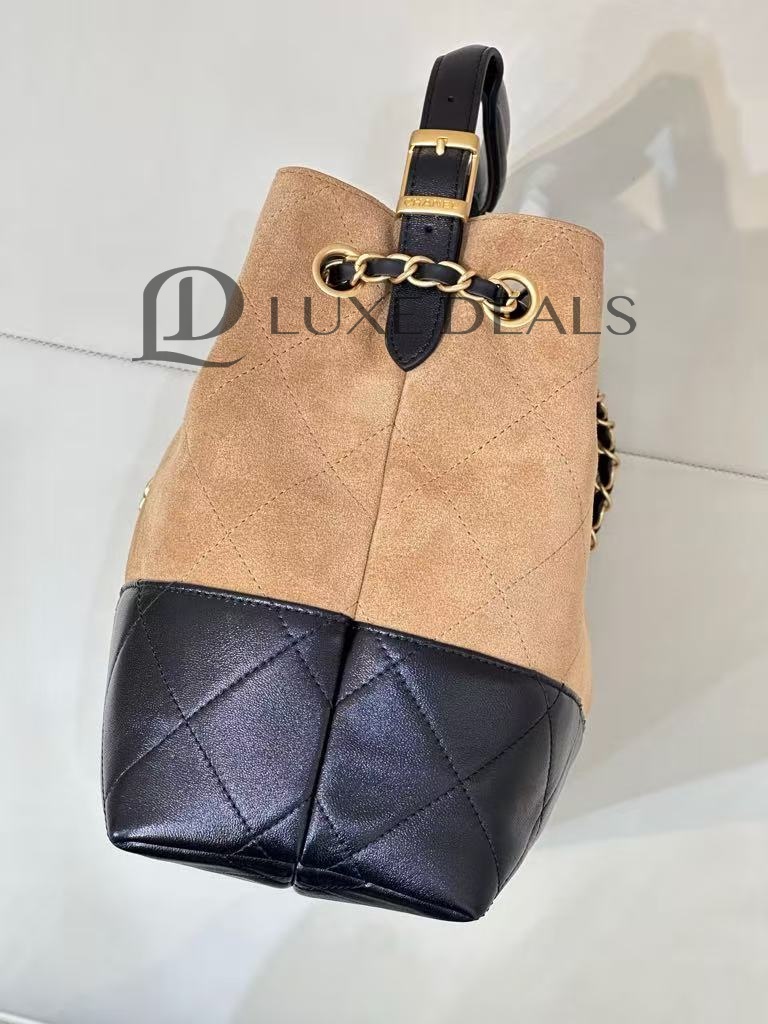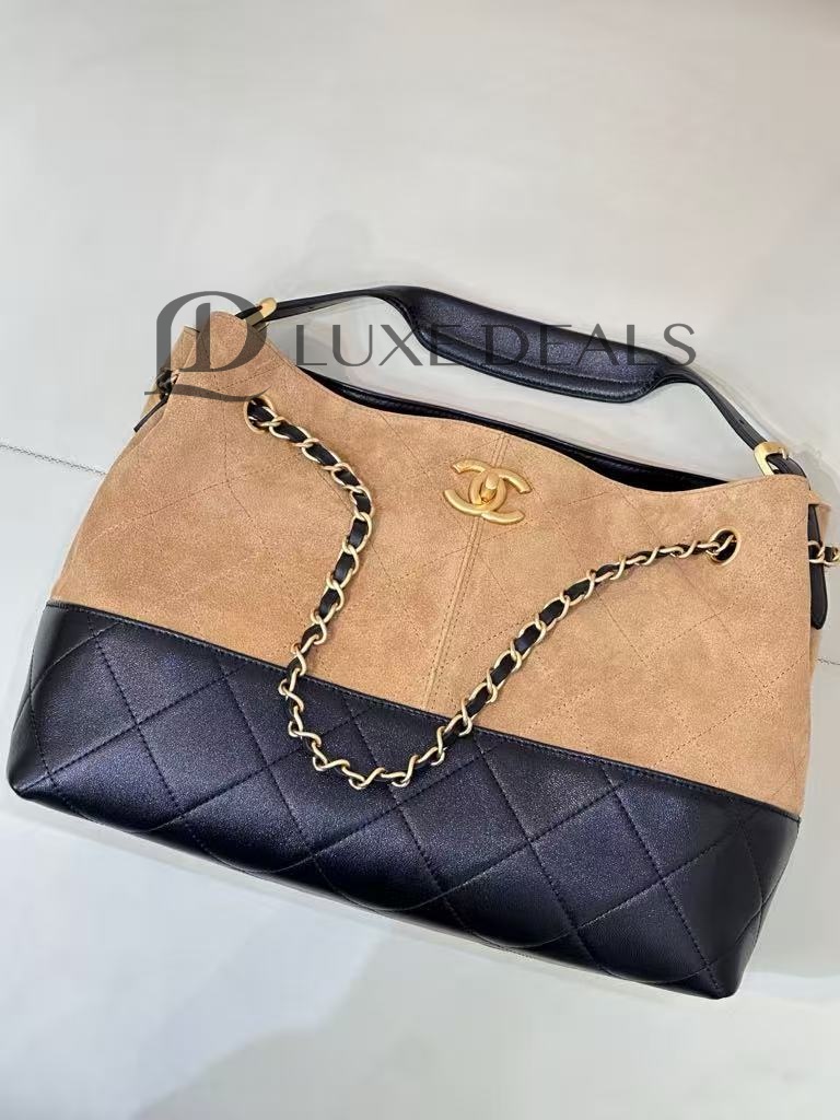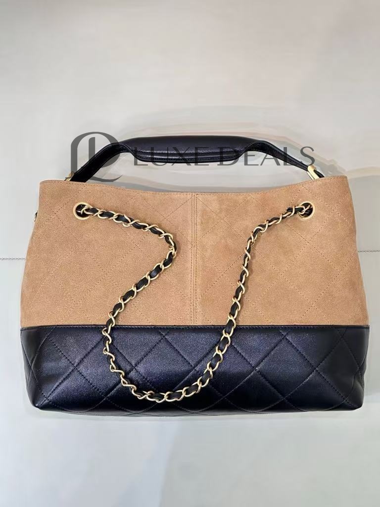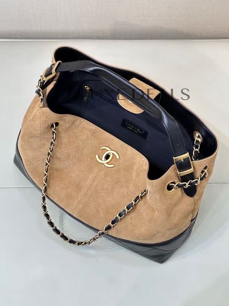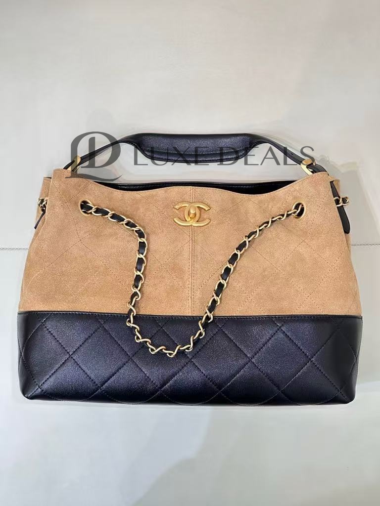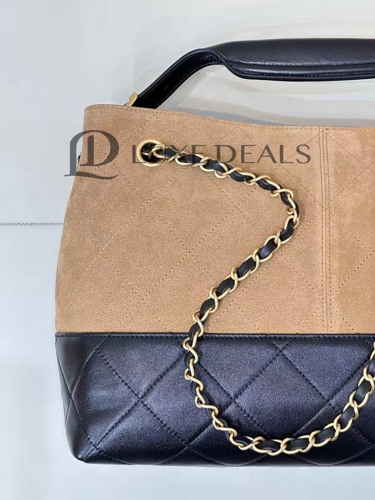 CH@NEL SHOPPING BAG SUEDE CALFSKIN, SHINY LAMBSKIN & GOLD-TONE METAL BEIGE & BLACK AS5634 (36*24*12cm)