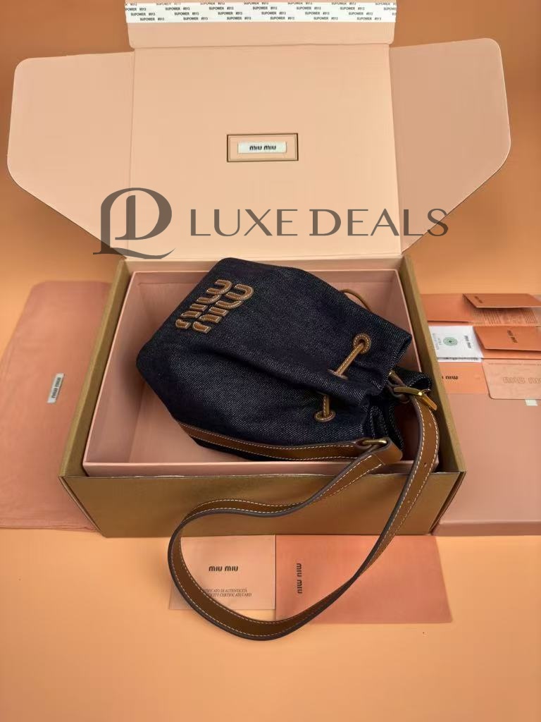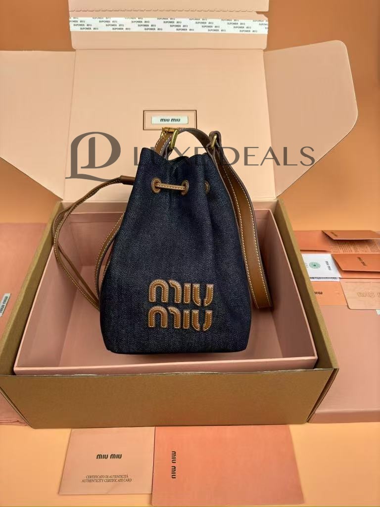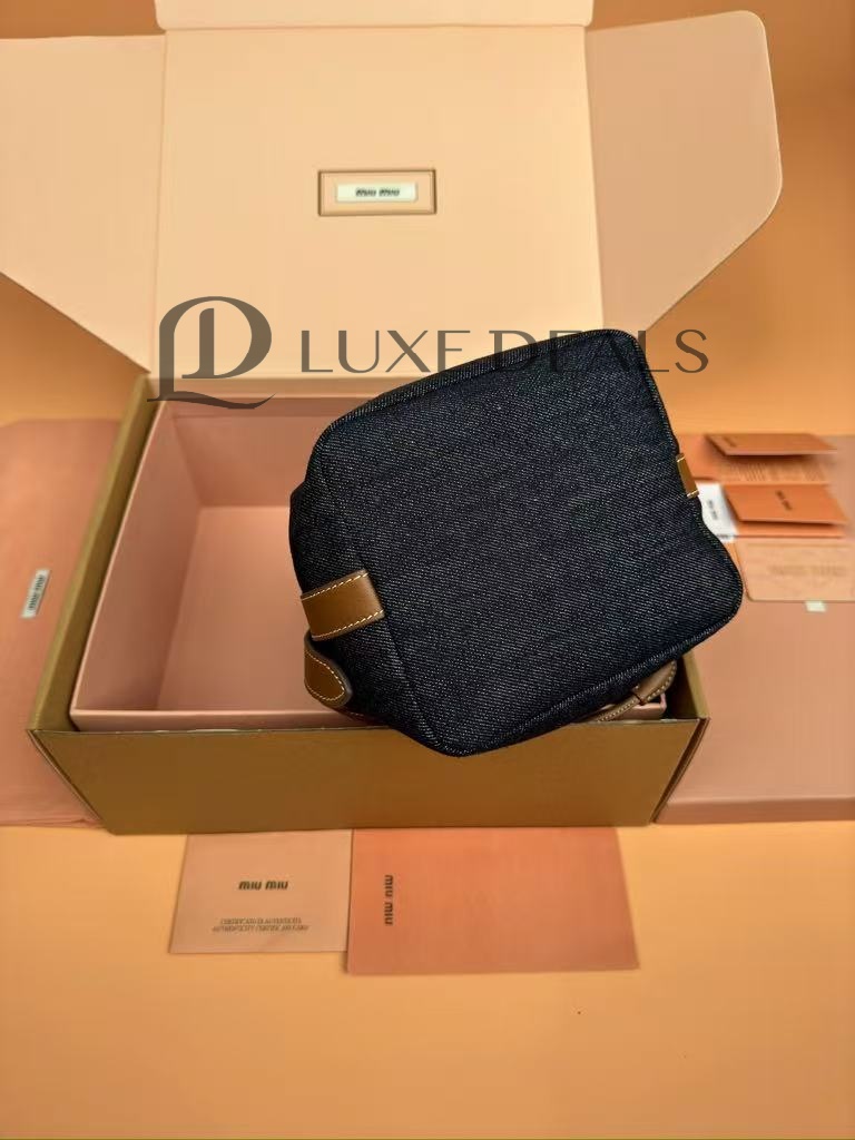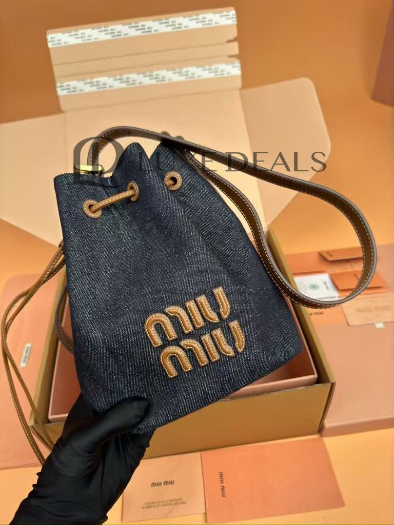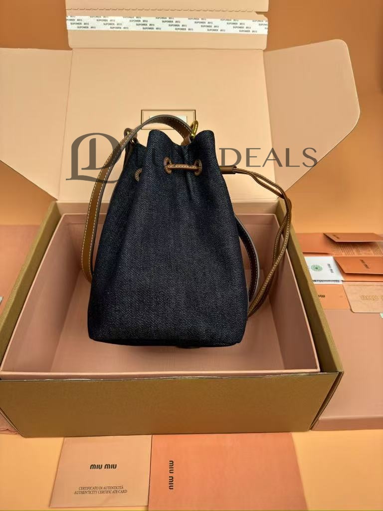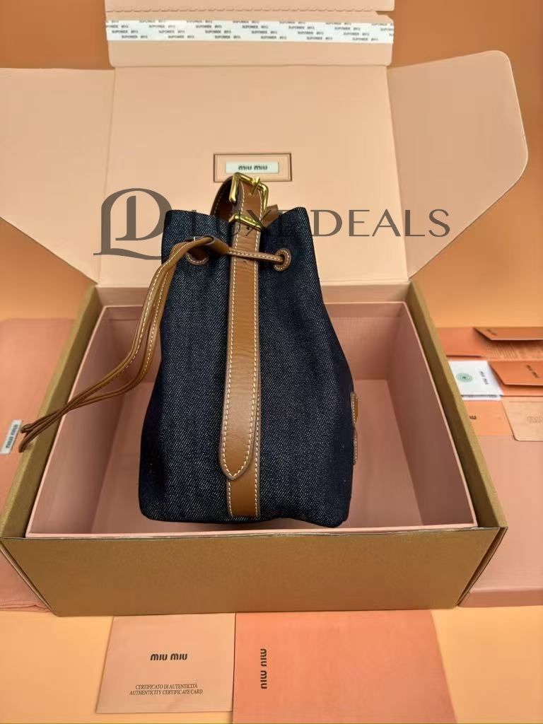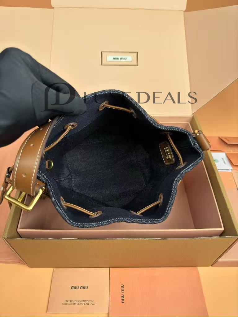 MIU MIU DENIM AND LEATHER LOGO BUCKET BAG 5BE090 (22.5*16*14cm)