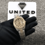 The dial is a masterpiece on its own with its diamond-colored backdrop that shimmers under the light. paired perfectly with Arabic numerals that add a unique cultural and aesthetic value. The stainless steel stick hands glide over this artistic dial. ensuring every glance at your wrist is an experience in elegance and practicality. This rolex arabic dial doesn’t just tell time; it tells stories of sophistication and luxury.