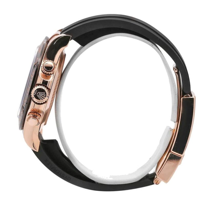 This Rolex Cosmograph Daytona Everose Gold Ivory Dial 116515LN-0014 Replica is a high quality watch. It features a 904L stainless steel case with a rose gold color and a black bezel. The sapphire crystal is 40.00 mm in size and 12.40 mm in thickness. The rubber bracelet is adjustable and has a black color with a 904L stainless steel folding clasp in rose gold. The ivory dial has stick and dot indices with 904L stainless steel stick hands. The movement is an automatic caliber 4130 with a 60-hour power reserve and a precision of (-3/+3 sec/day) within COSC certification limits.