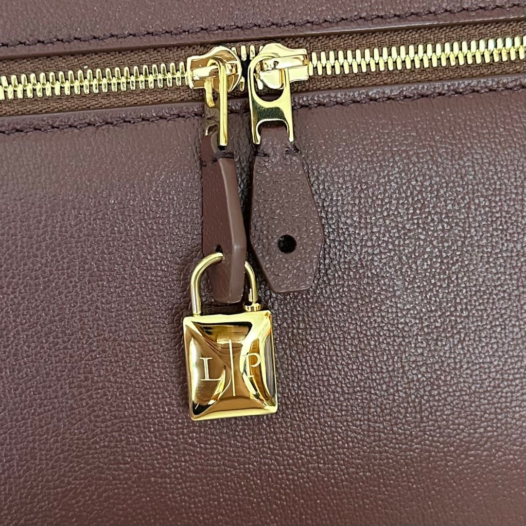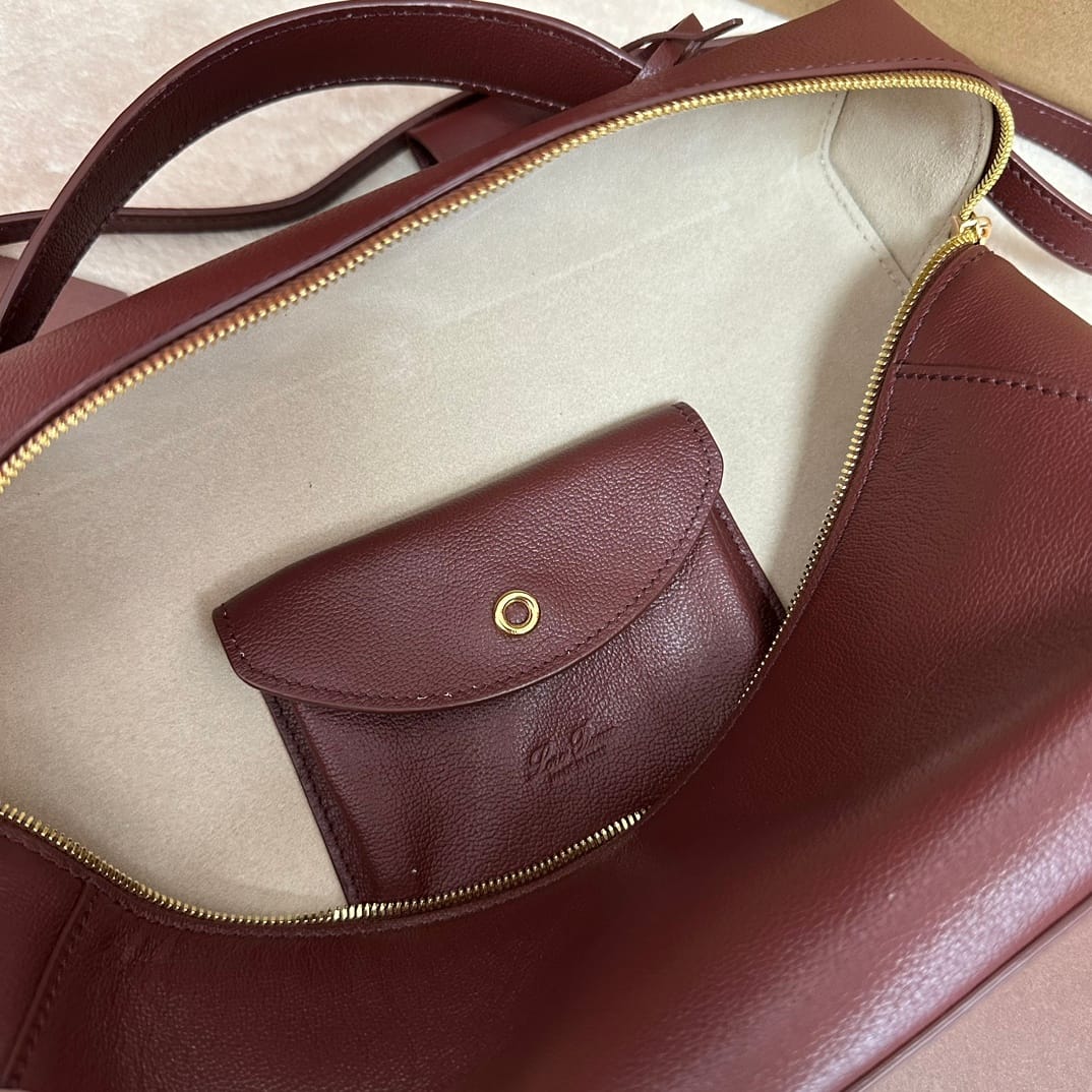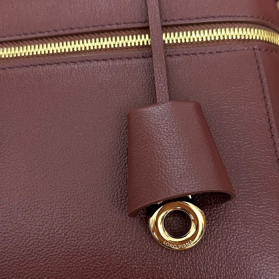 Leather pocket inside featuring the new signature press stud in the shape of Loro Piana ring, with laser engraved logo