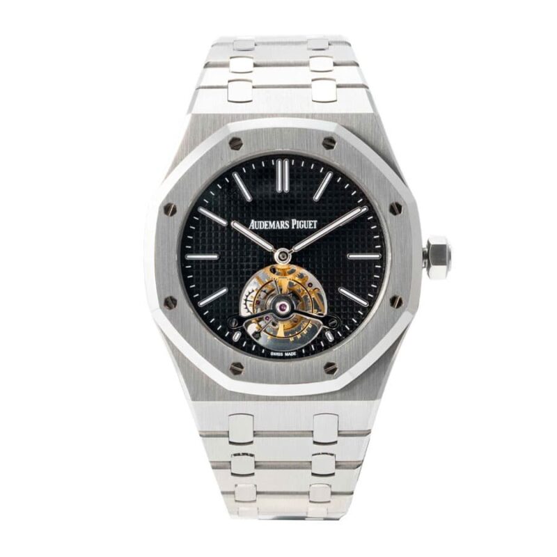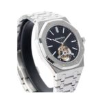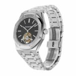 The Royal Oak Tourbillon Black Replica from Audemars Piguet is a striking watch. It features a 904L stainless steel case and bezel. with a sapphire crystal and a steel color. The movement is an Automatic AP 2924 caliber with a power reserve of 60 hours and a precision of (-3/+3 sec/day) within COSC certification limits. The dial is nicknamed Tapisserie Evolutive and is black with stick indices and stick hands. It also features a Royal Oak Bracelet with adjustable links and a fold clasp.